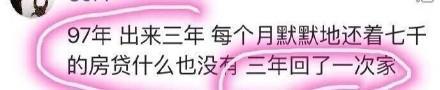 97年,出來(lái)三年,每個(gè)月7000房貸之后什么也沒(méi)有,3年只回了一次家。