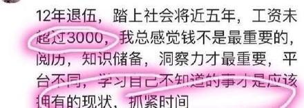 12年退伍,在社會(huì)上5年,工資未超過(guò)3000元,但是感覺(jué)錢(qián)不是最重要的,只是儲(chǔ)備,洞察力才重要,學(xué)習(xí)自己不知道是才是應(yīng)該有的狀態(tài)。