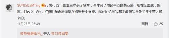 95年,創(chuàng)業(yè)三年買(mǎi)了輛車(chē),今年買(mǎi)了市區(qū)中心的商業(yè)房,現(xiàn)在全國(guó)排,旅游。月收入一萬(wàn)+,打算明年定居鳳凰哪里開(kāi)個(gè)客棧,現(xiàn)在的著寫(xiě)我都不敢想我是吃了多少苦才換來(lái)的。