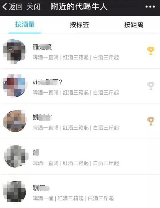 顧客可在APP中選擇一名代喝人,用短信等方式與其取得聯(lián)系將其叫至酒桌即可。而使用該服務(wù)所需支付的費(fèi)用則與酒席持續(xù)的時(shí)間、所喝酒量有關(guān),由用戶與代喝人之間商量后決定。