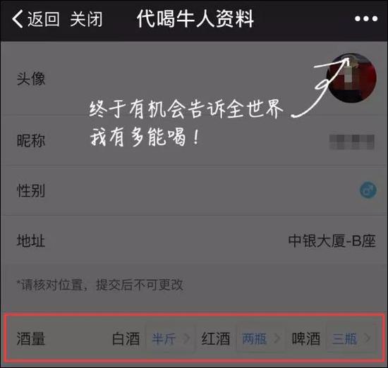 用戶在軟件中輸入或設(shè)置自己的位置,手機(jī)畫(huà)面的地圖上就會(huì)顯示出附近的 “代喝人”。這些“代喝人”在提供“代喝”服務(wù)之前,會(huì)提前在軟件上的個(gè)人信息中寫(xiě)明自己的酒量、喜歡的酒類(lèi)以及性別等基本信息。無(wú)論是誰(shuí)都可以成為代喝人。