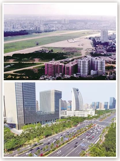 拼版照片為海口市國(guó)興大道,曾經(jīng)是海口大英山機(jī)場(chǎng)(上圖為1999年5月新華社記者姜恩宇攝,下圖為2018年4月14日新華社記者郭程攝)。 新華社發(fā)