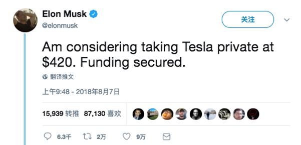 當(dāng)?shù)貢r間8月7日,馬斯克發(fā)推表示,正考慮將特斯拉以每股420美元(對應(yīng)市值約720億美元)的價格將其私有化,并且資金已經(jīng)到位。