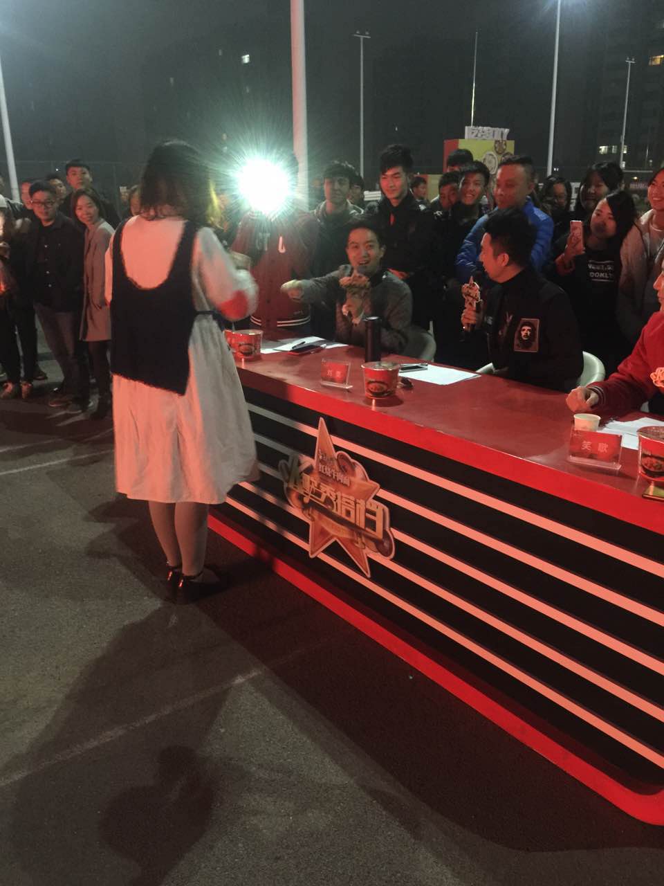 整場(chǎng)海選持續(xù)到天黑,非常有趣的是,可能是大家剛開(kāi)始都持觀望態(tài)度,臨近天黑的時(shí)候,真正的好聲音才開(kāi)始登上舞臺(tái),比賽的十強(qiáng)幾乎都產(chǎn)生在最后上場(chǎng)的十位選手中,評(píng)委現(xiàn)場(chǎng)不僅在盲選,而且在不斷的更新五強(qiáng)的名單,以至于,最后覺(jué)得只選五強(qiáng)臺(tái)可惜了,在和導(dǎo)演組商議之后,晉級(jí)名額直接增加到了十個(gè)。他們將和前五場(chǎng)康師傅紅燒牛肉面《名嘴K歌秀》校園海選選拔出來(lái)的選手一起,參加《名嘴K歌秀》第三季,獲得和名嘴演唱的機(jī)會(huì)。