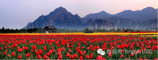 在嵖岈山天磨湖景區(qū)外,有著近300畝約有100多萬株的荷蘭郁金香種植基地,顏色多達36種之多。