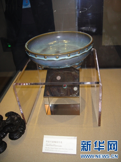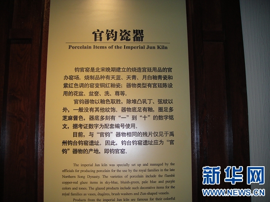 鈞官窯遺址博物館位于禹州市鈞官窯路北段,是該市籌資1.2億元,經過三年時間精心打造而成的全國唯一一座鈞瓷專題博物館。走進宋鈞官窯遺址博物館,一件件造型典雅、端莊古樸、釉色瑩潤、五彩繽紛吸引了記者的眼球,館內共有1500多件熠熠生輝的鈞瓷藏品, 在二樓鈞官窯瓷器展示廳,一件鈞窯天藍釉鼓釘洗的瓷器吸引了很多人關注,據館長介紹,這件瓷器所有權不屬于博物館,而是他們從國外借來的。過去由于多種原因,很多精美的瓷器都流失國外,有些回流到了國內,而有些只能暫時借過來,才能讓更多人一睹它的風采。