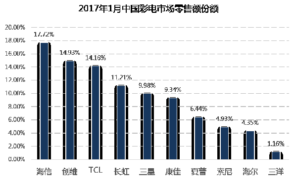 根據(jù)中怡康最新發(fā)布的2017年1月份月報統(tǒng)計數(shù)據(jù),海信電視零售量、零售額占有率分別達到16.7%和17.7%,雙雙高居中國彩電市場銷售量和銷售額占有率的第一位,其中銷售額占有率超出第二名2.79個百分點.