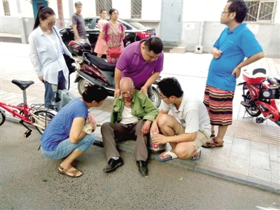 本報訊 8月14日18時許,嵩山路與伊河路交叉口東北角,一位老人行走中搖搖晃晃地倒在了人行道上。