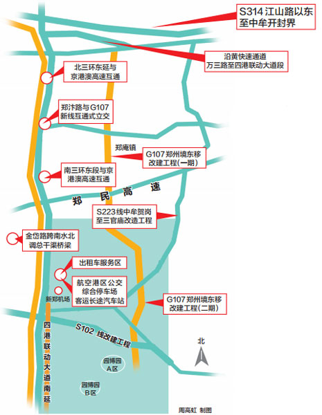 ●2009年9月,G107鄭州段第二次改建。這條路緊臨京港澳高速,北接107輔道申莊互通式立交,南至航空港迎賓大道,于2012年4月正式交付使用。也就是人們常說的新107國道,即現(xiàn)在的“四港聯(lián)動大道”。