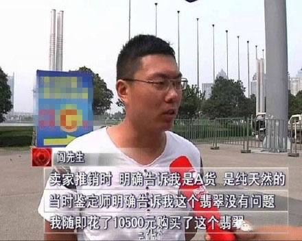 鄭州市民閻先生花了10500元在珠寶展銷會(huì)上買了一塊號(hào)稱A貨的翡翠,然而,鑒定結(jié)果卻顯示他買的其實(shí)是劣質(zhì)的B貨,也就是強(qiáng)酸腐蝕后人工加工的翡翠。目前,該展位賣家不見(jiàn)蹤影,主辦方也稱自己無(wú)責(zé)任。