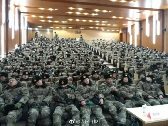 這張照片攝于南京建鄴區(qū)文化藝術(shù)中心小劇場(chǎng),26日清晨,某舟橋旅官兵540余人,結(jié)束徹夜掃雪除冰任務(wù)后,在此休息。他們中絕大部分是90后、95后。