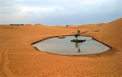 騰格里沙漠深處有一小湖泊,被開(kāi)發(fā)成旅游景點(diǎn)。不過(guò),由于地下水開(kāi)采加劇,這個(gè)湖泊越來(lái)越萎縮。