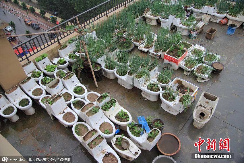 2015年07月16日,山東省菏澤市,在中央公館小區(qū)21號(hào)樓樓頂?shù)南榔脚_(tái)上,有業(yè)主擺放了數(shù)十個(gè)廢棄馬桶,種上了各種蔬菜。還用廢舊沙發(fā)搭起了鴨棚,養(yǎng)起了鴨子。在樓頂?shù)慕锹淅?,記者還發(fā)現(xiàn)了一個(gè)簡易廁所。該樓居民表示,“菜園”的主人平時(shí)就直接使用廁所糞便作為蔬菜的肥料。天氣炎熱時(shí),氣味很大,附近居民苦不堪言。