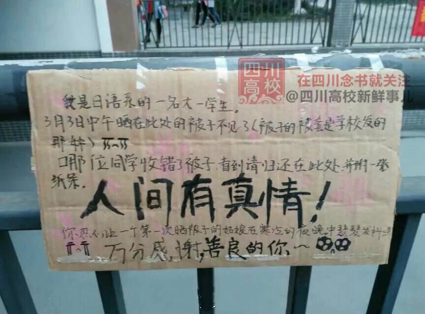 近日,四川外國語大學(xué)成都學(xué)院一女生在校內(nèi)曬的被子被其他同學(xué)誤拿,這位女生通過“人間有真情”海報(bào)、一系列“請(qǐng)往右看”便簽來定位一床沒人收的被子,以此尋找拿錯(cuò)被子的同學(xué)。這個(gè)萌辦法讓網(wǎng)友紛紛點(diǎn)贊。