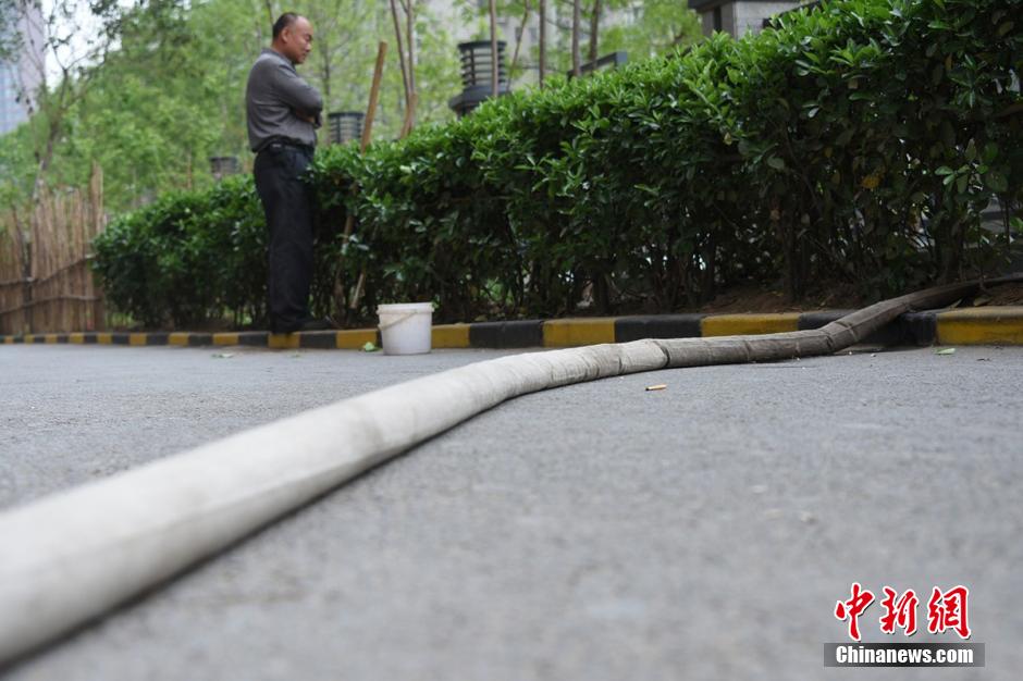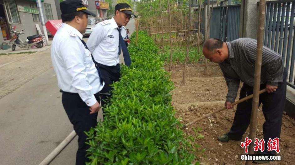 4月5日上午9時(shí)許,未來(lái)路街道巡防隊(duì)員司廣紅、盧龍等三人巡邏中發(fā)現(xiàn)一件奇葩事:有一根消防管從燕莊新區(qū)南院9號(hào)樓北面的20樓一家住戶窗口被放下,水管的另一頭直通小區(qū)柵欄里的小菜園。鄭州市燕莊村一村民住上了高樓,卻仍然放不下種地種菜。把小區(qū)垃圾清理出來(lái),開墾出一片小菜園,又從20層的高樓往下放水澆菜。這種菜的成本遠(yuǎn)高于買菜,但他卻樂在其中。李四信 攝 圖片來(lái)源:視覺中國(guó)