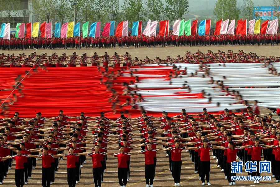 4月7日,在河南登封少林塔溝武術(shù)學(xué)校練功場(chǎng),上課間操的學(xué)員疊起人塔。當(dāng)日,河南登封少林塔溝武術(shù)學(xué)校2016年“春訓(xùn)”拉開帷幕,2.6萬名學(xué)員同上陣,進(jìn)行隊(duì)形變換、十八般兵器、少林硬氣功、少林集體棍等多種功法演練。“春訓(xùn)”是少林塔溝武術(shù)學(xué)校每年春季開展的一項(xiàng)強(qiáng)化訓(xùn)練活動(dòng),旨在提升學(xué)員的耐力和競(jìng)技狀態(tài)。新華社發(fā)(牛書培 攝)
