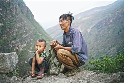 圖為5月14日,在三名家長的保護(hù)下,15個(gè)孩子從勒爾小學(xué)出發(fā),走崖壁,爬藤梯,踏上回家的路。4月27日,阿土勒爾村的一個(gè)村民摔下了懸崖,村子里的大人對在山下讀書的孩子更加擔(dān)心起來。阿土勒爾村有15個(gè)6至15歲的孩子在山腳下的勒爾小學(xué)上學(xué),平時(shí)住校,每月月中和月底的周末才回家。每次上下山,家長們都會輪流接送。5月14日是家長接孩子的日子,清晨6點(diǎn)多,30多歲的陳古吉帶著背包繩和另外兩個(gè)家長一起下山接孩子。村里身手敏捷的年輕人,下山通常需要1小時(shí),上山大約90分鐘,對于外來的人,通常是這個(gè)時(shí)間的兩倍。