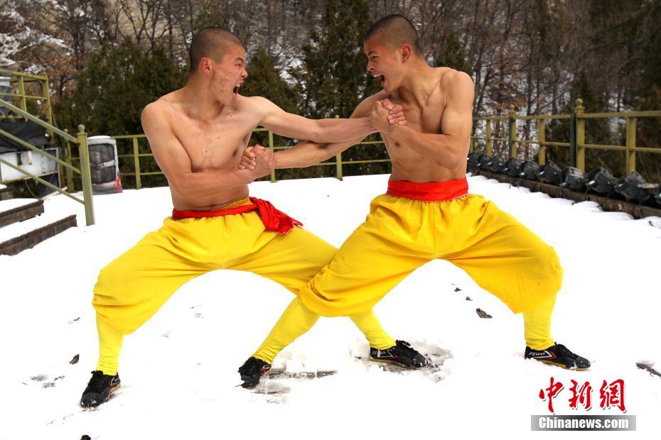 2月22日,河南出現(xiàn)暴雪天氣,氣溫驟降,少林寺所在地登封嵩山白雪茫茫,銀裝素裹,武僧們赤膊上身在冰天雪地里苦練少林功夫。盡管寒風(fēng)刺骨,少林武僧們依舊照常練功,只見(jiàn)他們赤膊上陣,不懼寒冷,在雪窩里扎馬步、練少林棍、刀槍對(duì)戰(zhàn)。他們中間最小的只有6歲。 中新社記者 王中舉 攝