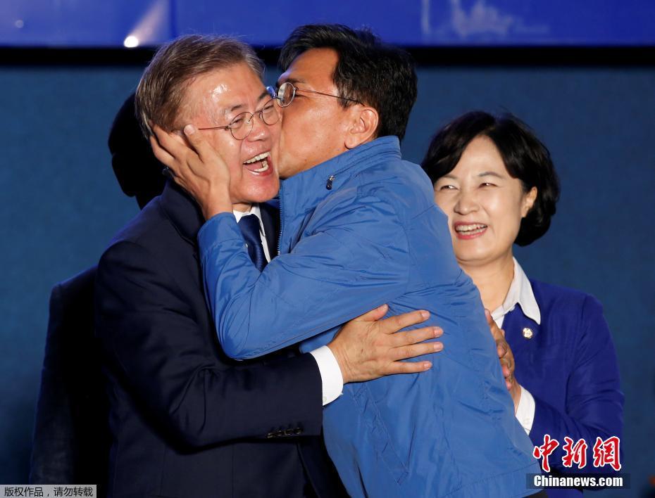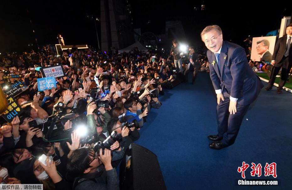 當?shù)貢r間5月9日深夜,韓國第19屆總統(tǒng)選舉共同民主黨候選人文在寅及其競選團隊現(xiàn)身首爾光化門廣場,發(fā)表“勝選演說”,與支持民眾握手慶祝。據(jù)出口民調(diào)顯示,文在寅在當日進行的大選投票中以41.4%的支持率絕對優(yōu)勢勝選。在選舉管理委員會公布的大部分開票結果中,文在寅得票率也遙遙領先,提前鎖定勝局。