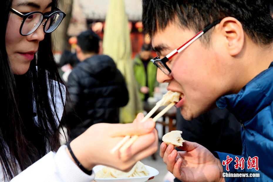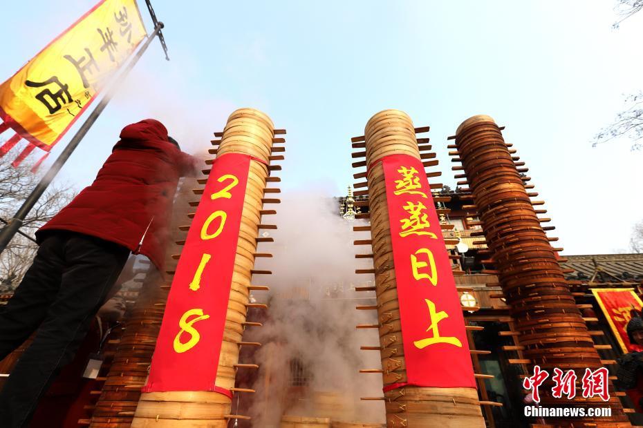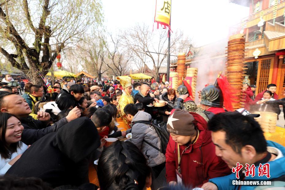 2018年1月1日,河南開封清明上河園孫羊正店門前,現(xiàn)場高高疊起的小籠包熱氣騰騰,小籠包上喜慶的紅字寫著“2018”“蒸蒸日上”。“宋徽宗”帶領“后宮佳麗”為游客免費發(fā)放剛剛蒸好的小籠包,寓意新的一年“蒸蒸日上”,吸引數(shù)千名游客爭相品嘗求好運。據(jù)清明上河園市場部石經理介紹,為了給游客送上這份新年祝福,清明上河園啟用了多個地方一起蒸小籠包,當天共準備了2018籠開封名吃“灌湯包”,在多個發(fā)放點陸續(xù)為民眾送上新年的“免費午餐”,祝愿大家都能夠在新的一年里“蒸蒸日上”。中新社記者 王中舉 攝