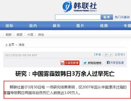韓聯(lián)社的意思似乎是:連中國學(xué)者做的研究都能證明,韓國人的健康被中國霧霾所傷。