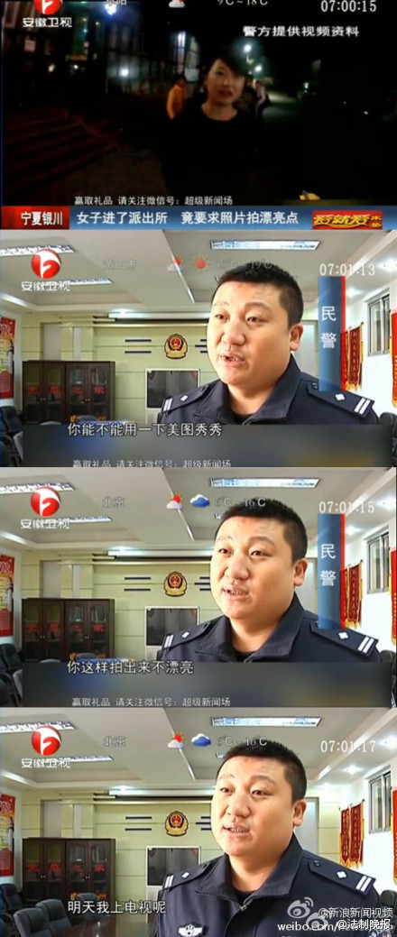 人民網(wǎng)北京11月4日電 據(jù)寧夏回族自治區(qū)公安廳官方微博消息,日前,寧夏銀川,一名女子因搶奪執(zhí)法記錄儀,阻撓執(zhí)法被警察帶走。民警在審訊室準(zhǔn)備對(duì)其拍照時(shí),女子竟然要求民警用美圖軟件,聲稱:“你這樣拍出來(lái)不漂亮,明天我上電視吶?!?/p>