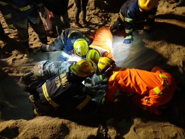 圖為消防官兵和附近居民幫忙挖沙救人。