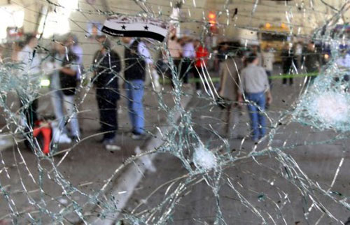 4月27日敘利亞首都大馬士革爆炸現(xiàn)場(chǎng),一輛中巴窗戶玻璃被震碎