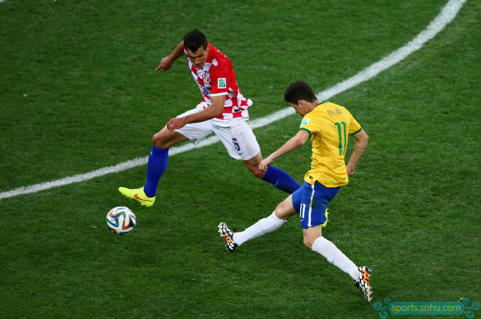 在巴西和克羅地亞的比賽最后時(shí)刻,拉米雷斯中場(chǎng)斷球,奧斯卡單騎闖關(guān),在禁區(qū)邊緣一記捅射再次洞穿普萊蒂科薩的十指關(guān),3-1,巴西鎖定勝局。最終,巴西隊(duì)?wèi){借內(nèi)馬爾的2個(gè)進(jìn)球,3-1逆轉(zhuǎn)克羅地亞贏得本屆世界杯的開門紅。圖為奧斯卡捅射瞬間