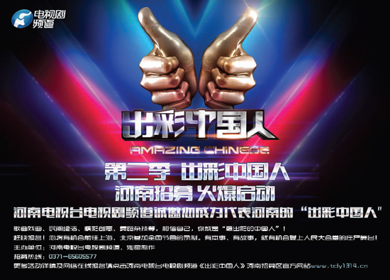 第二季《出彩中國(guó)人》河南招募火熱開(kāi)啟,河南電視臺(tái)電視劇頻道誠(chéng)邀您成為代表河南的“出彩中國(guó)人”。歌曲戲曲、民間絕活、精彩創(chuàng)意、舞蹈雜技等,相信自己,你就是“最出彩的中國(guó)人”!趕快報(bào)名,您將有機(jī)會(huì)前往上海、北京參加全國(guó)節(jié)目的錄制。有本事、有故事,就有機(jī)會(huì)登上人民大會(huì)堂的莊嚴(yán)舞臺(tái)!