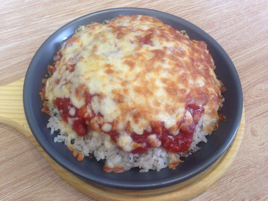 3.將炒好的醬汁澆在米飯上,鋪上一層奶酪,放入烤箱烤制十分鐘即可。
