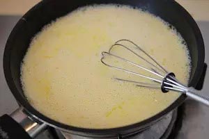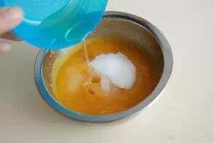 1、蛋黃、細(xì)砂糖、牛奶全部倒入小鍋中,并攪拌均勻。