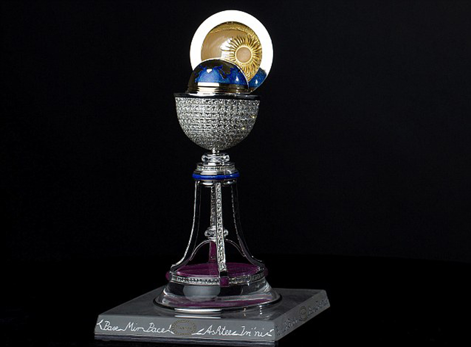 打開(kāi)“幻影蛋”蛋殼后,可以看到里面裝飾華麗的迷你地球儀。將地球儀頂端提起,里面是用無(wú)色水晶雕成的白鴿,棲息在黃金橄欖枝上,還有黃金手工雕刻的“世界和平”字樣。這個(gè)“幻影蛋”是精英工匠歷時(shí)3年方才打造完成的。