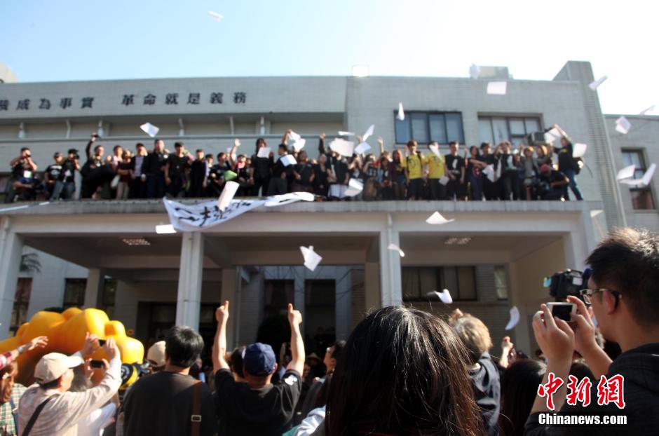4月10日,以反“兩岸服貿(mào)協(xié)議”為名的臺(tái)灣學(xué)生離開了他們占據(jù)24天的“立法院”議場(chǎng)。 當(dāng)天下午3時(shí)半許,一部分原來從架設(shè)的鋁梯爬上“議場(chǎng)”后門水泥頂棚,再從二樓窗戶爬窗進(jìn)入“議場(chǎng)”的學(xué)生,身背隨身用品,選擇從原路離開,人數(shù)約有50人。圖為學(xué)生在“議場(chǎng)”后門頂棚集結(jié)準(zhǔn)備撤出。中新社發(fā) 陳立宇 攝