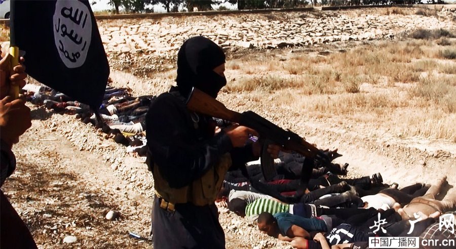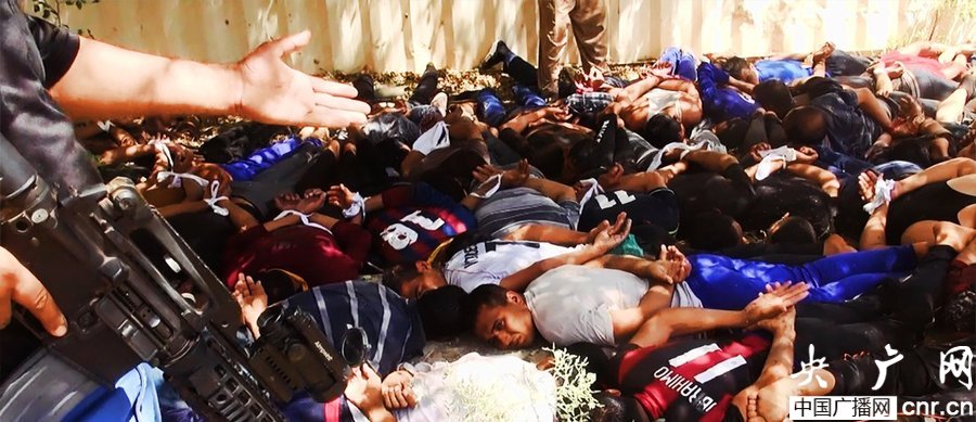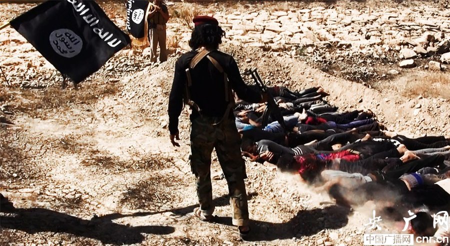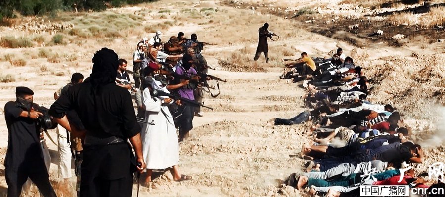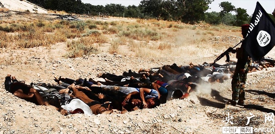 當(dāng)?shù)貢r(shí)間2014年6月14日,伊拉克薩拉赫丁,伊拉克極端武裝“伊拉克和黎凡特伊斯蘭國(guó)”武裝人員處決大量俘虜?shù)囊晾耸勘?/p>