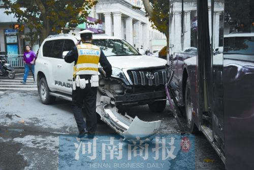 26日下午1點10分,在鄭州市花園路與緯一路交叉口東南角,一輛白色越野車與一輛紅色公交車“如膠似漆”。越野車整個前保險杠脫落,而公交車右后輪的護板掉落。