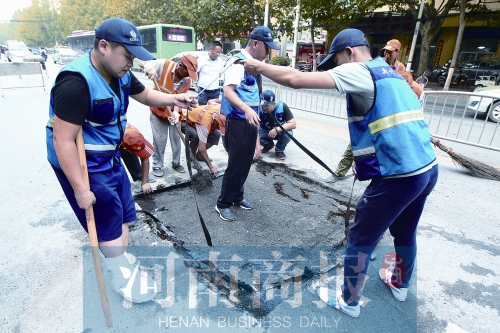 臺風(fēng)“天鴿”讓鄭州下了幾天的雨,許多道路積水塌方車輛陷進(jìn)去。中央氣象臺預(yù)報(bào)臺風(fēng)“帕卡”已經(jīng)登陸南方,受其影響鄭州又將面臨幾天的降雨,道路養(yǎng)護(hù)工們要趕在降雨前修復(fù)路面坑槽,預(yù)防各種危害的發(fā)生。